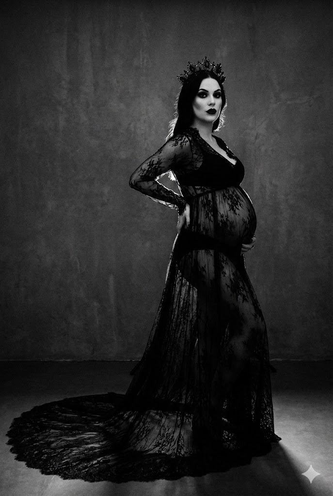 The "Gothic Glam" trend is a sophisticated, dramatic counterpoint to the softer, Celestial styles. It is designed for the mother who rejects the notion of being a "soft pink princess" and instead demands to be photographed as a powerful, edgy matriarch. This look is the synthesis of Wednesday Addams meets Vogue, blending refined tailoring with intense, dramatic lighting.